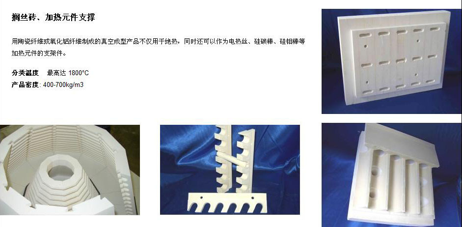用陶瓷纖維或氧化鋁纖維制成的真空成型產(chǎn)品不僅用于絕熱,同時還可以作為電熱絲、硅碳棒、硅鉬棒等加熱元件的支架件。