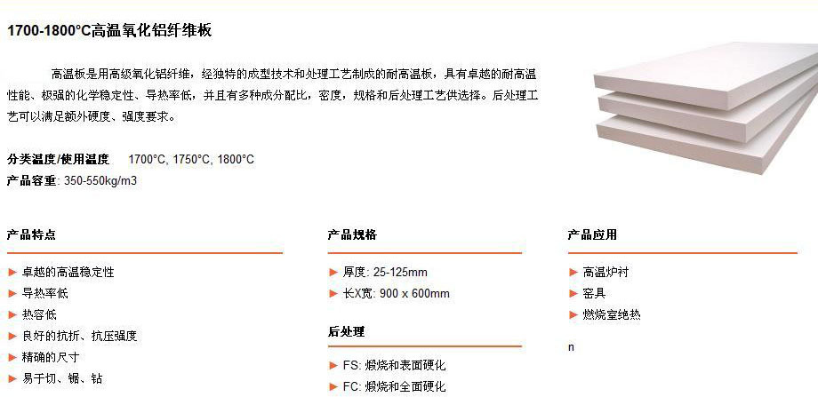 高溫板是用高級氧化鋁纖維,經(jīng)獨(dú)特的成型技術(shù)和處理工藝制成的耐高溫板,具有卓越的耐高溫性能、極強(qiáng)的化學(xué)穩(wěn)定性、導(dǎo)熱率低,并且有多種成分配比,密度,規(guī)格和后處理工藝供選擇。后處理工藝可以滿足額外硬度、強(qiáng)度要求。