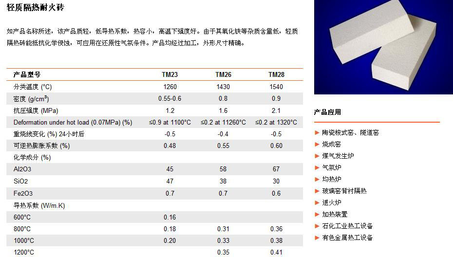 該產(chǎn)品質(zhì)輕,低導(dǎo)熱系數(shù),熱容小,高溫下強(qiáng)度好。由于其氧化鐵等雜質(zhì)含量低,輕質(zhì)隔熱磚能抵抗化學(xué)侵蝕,可應(yīng)用在還原性氣氛條件。產(chǎn)品均經(jīng)過加工,外形尺寸精確。