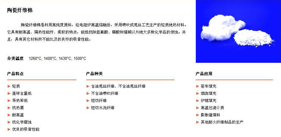 陶瓷纖維棉是利用高純度原料,經(jīng)電阻爐高溫熔融后,來用噴吹或甩絲工藝生產(chǎn)的輕質絕熱材料。它具有耐高溫、隔熱性能好、柔軟的特點,能抵抗除氫氟酸、磷酸和強堿以外絕大多數(shù)化學品的侵蝕。并且,具有其它材料所不能比及的良好的吸音性能。