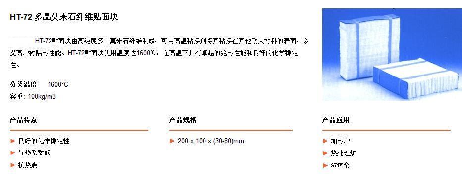 HT-72貼面塊由高純度多晶莫來石纖維制成,可用高溫粘接劑將其粘接在其他耐火材料的表面,以提高爐襯隔熱性能。HT-72貼面塊使用溫度達(dá)1600'C,在高溫下具有卓越的絕熱性能和良好的化學(xué)穩(wěn)定性。