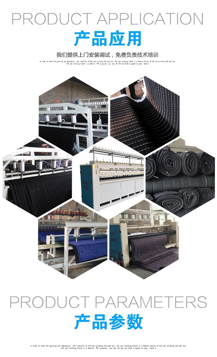 制作棉被時(shí),棉被的兩邊全部由雙針來(lái)包邊制作,同時(shí)此機(jī)也可以自動(dòng)鋪縫氈扣節(jié)省人工,做工漂亮結(jié)實(shí)。常用縫紉寬度有2米寬8-16條線(xiàn),3米寬18-22條線(xiàn),4米寬24-29條線(xiàn),以及雙排加密型2米寬28針,3米寬44針,4米寬54針等,以上多種尺寸可供用戶(hù)選擇,還可以根據(jù)客戶(hù)需求進(jìn)行特殊定做。