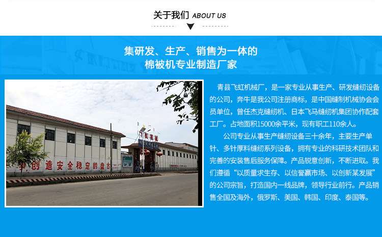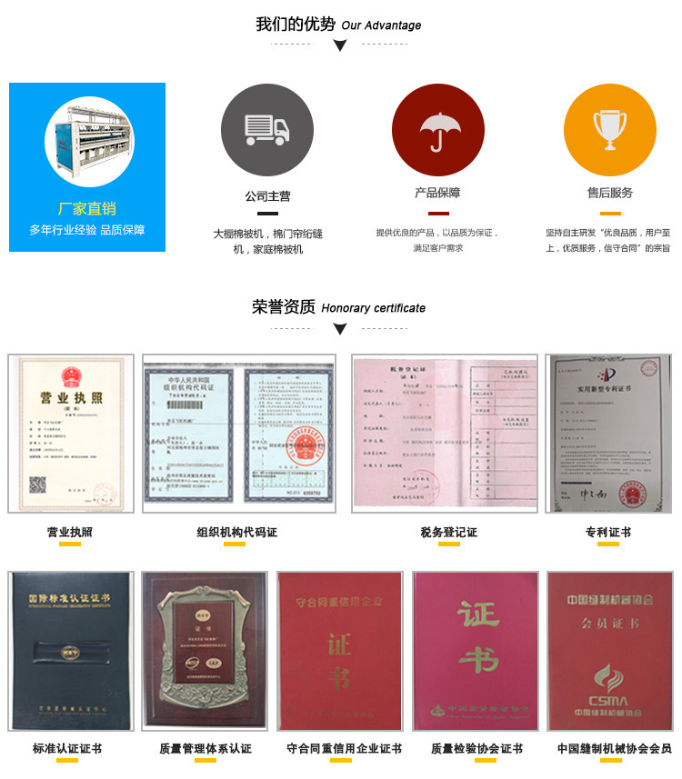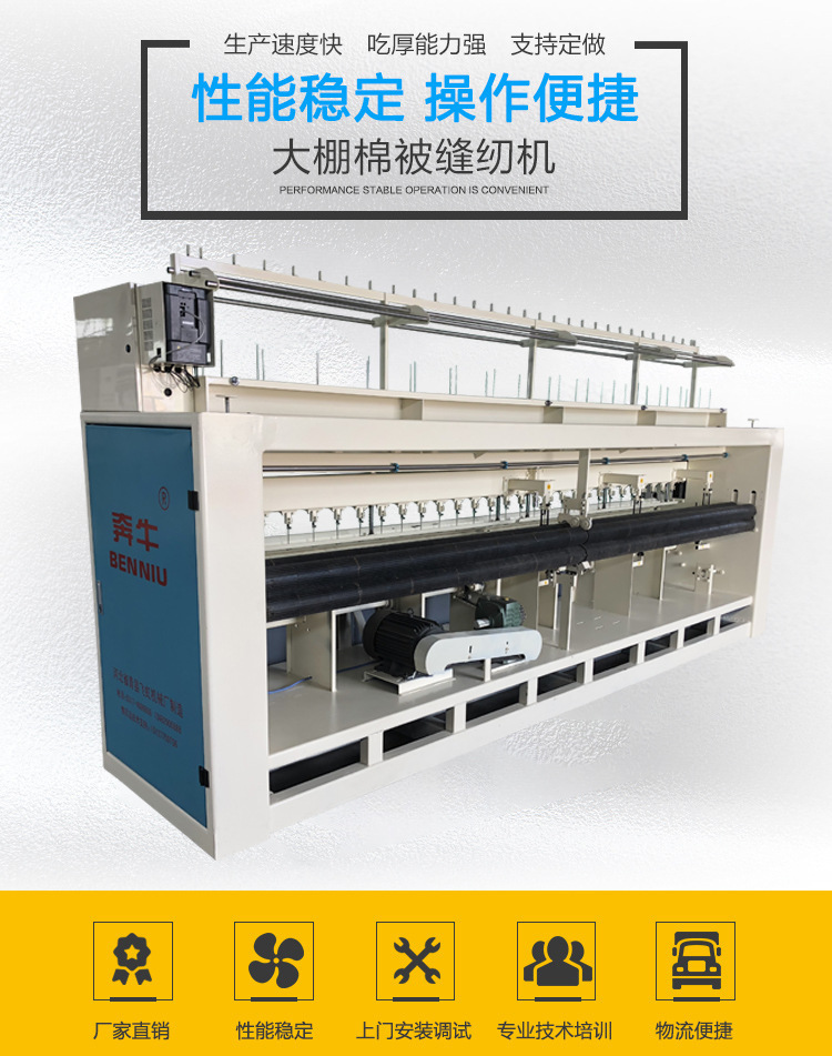 我廠(chǎng)生產(chǎn)全套大棚棉被制作生產(chǎn)線(xiàn)、棉門(mén)簾、家用棉被等大型棉制品生產(chǎn)線(xiàn),提供上門(mén)安裝調(diào)試,免費(fèi)負(fù)責(zé)技術(shù)培訓(xùn)。此機(jī)整合了我廠(chǎng)歷代棉被機(jī)的優(yōu)點(diǎn)和先進(jìn)經(jīng)驗(yàn)開(kāi)發(fā)出來(lái)的出色的一款大棚棉被縫紉機(jī),此機(jī)具融入了我廠(chǎng)新研發(fā)的先進(jìn)技術(shù)理念,具有先進(jìn)的防斷針、防跳線(xiàn)功能。在此基礎(chǔ)上真正意義上實(shí)現(xiàn)了生產(chǎn)速度快,縫厚能力強(qiáng),性能穩(wěn)定的效果。且?guī)缀鯖](méi)有易損件,頗受客戶(hù)好評(píng)!
