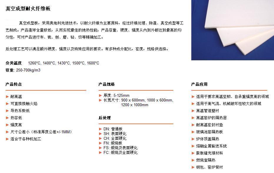 真空成型板,采用奧地利先進(jìn)技術(shù),以耐火纖維為主要原料,經(jīng)過(guò)纖維處理、除渣、真空成型等工藝制成。產(chǎn)品渣球含量極低,從而實(shí)現(xiàn)最佳的絕熱性能;產(chǎn)品容重、硬度、強(qiáng)度從內(nèi)到外都達(dá)到最高的均勻性,可對(duì)產(chǎn)品進(jìn)行車(chē)、銑、刨、磨、鉆、切等精確加工。
